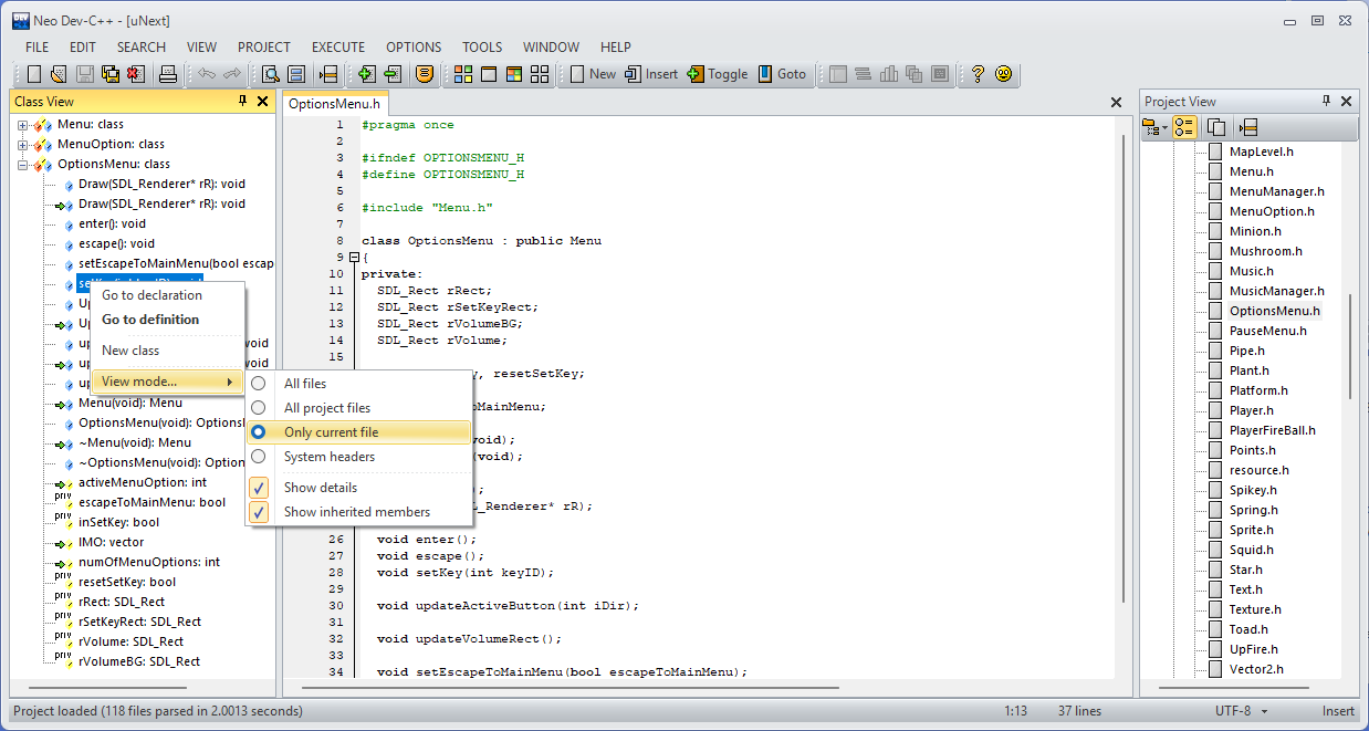 The ClassView window shows functions and methods, arguments and return types, inheritance, and visual glyphs for public, protected and private members for classes and types.